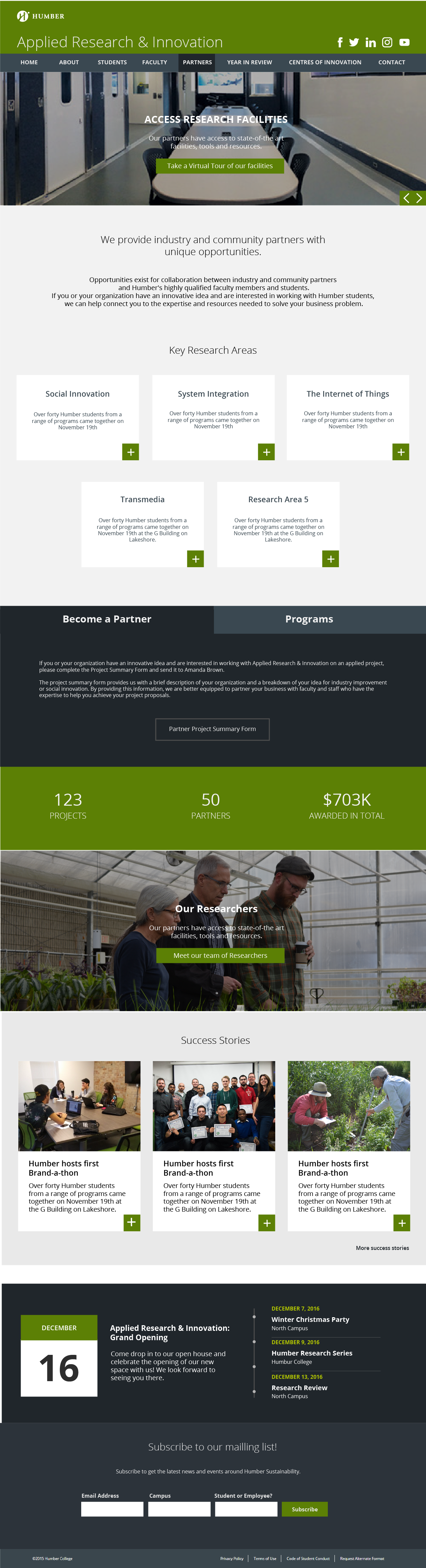 Perhaps one of the biggest challenges we faced in this project was the website had to appeal to Humber ARI's three audiences: Partners, Faculty and Students. Each one looking for different information in the same website.