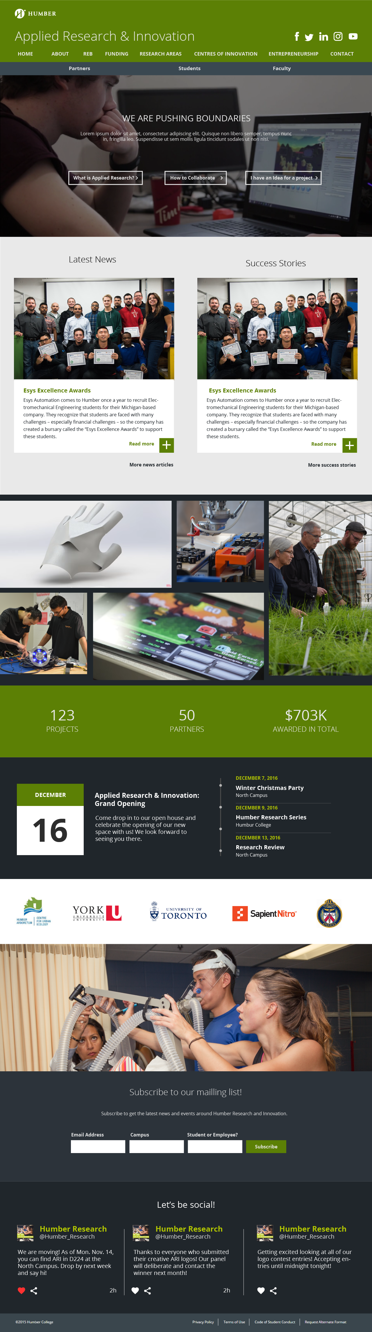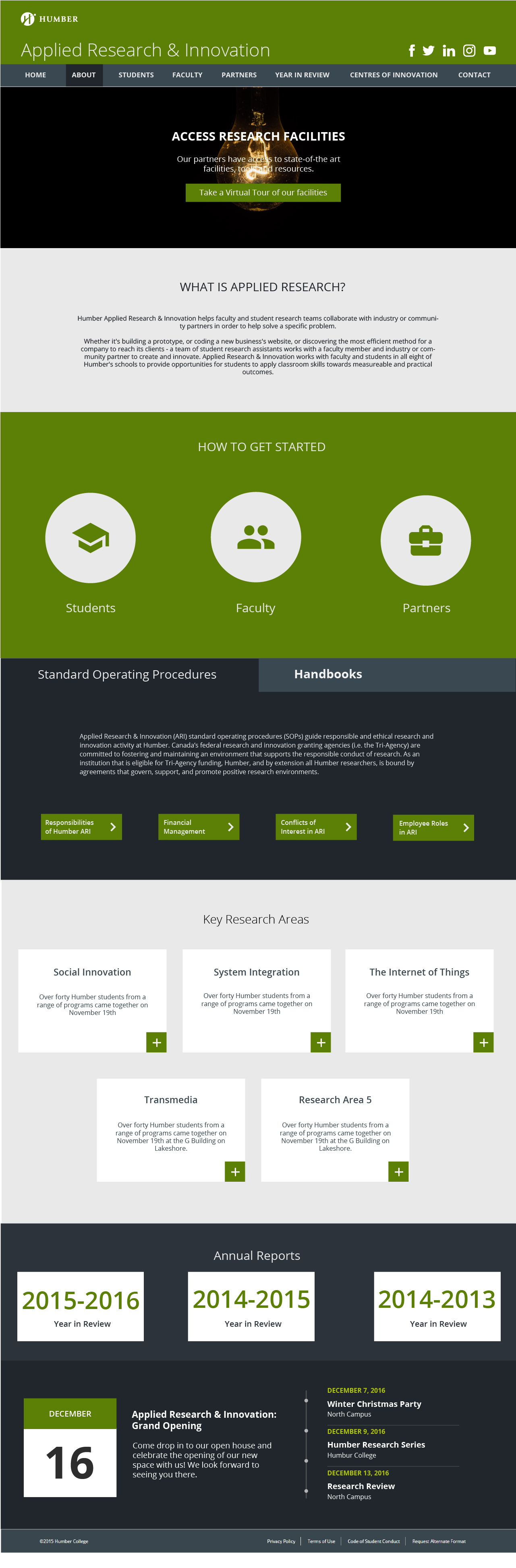 Humber Applied Research and Innovation (ARI) wanted to update the look of their website. Their site's look was outdated in comparison to Humber College's newly redesigned website. It was time for change. Humber ARI approached me and another student to design a new look for their site.